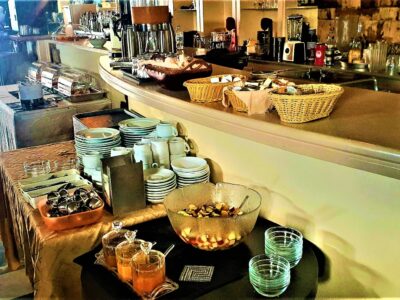 We serve breakfasts, snacks,food in our flowering courtyard or at the swimming pool bar all day.